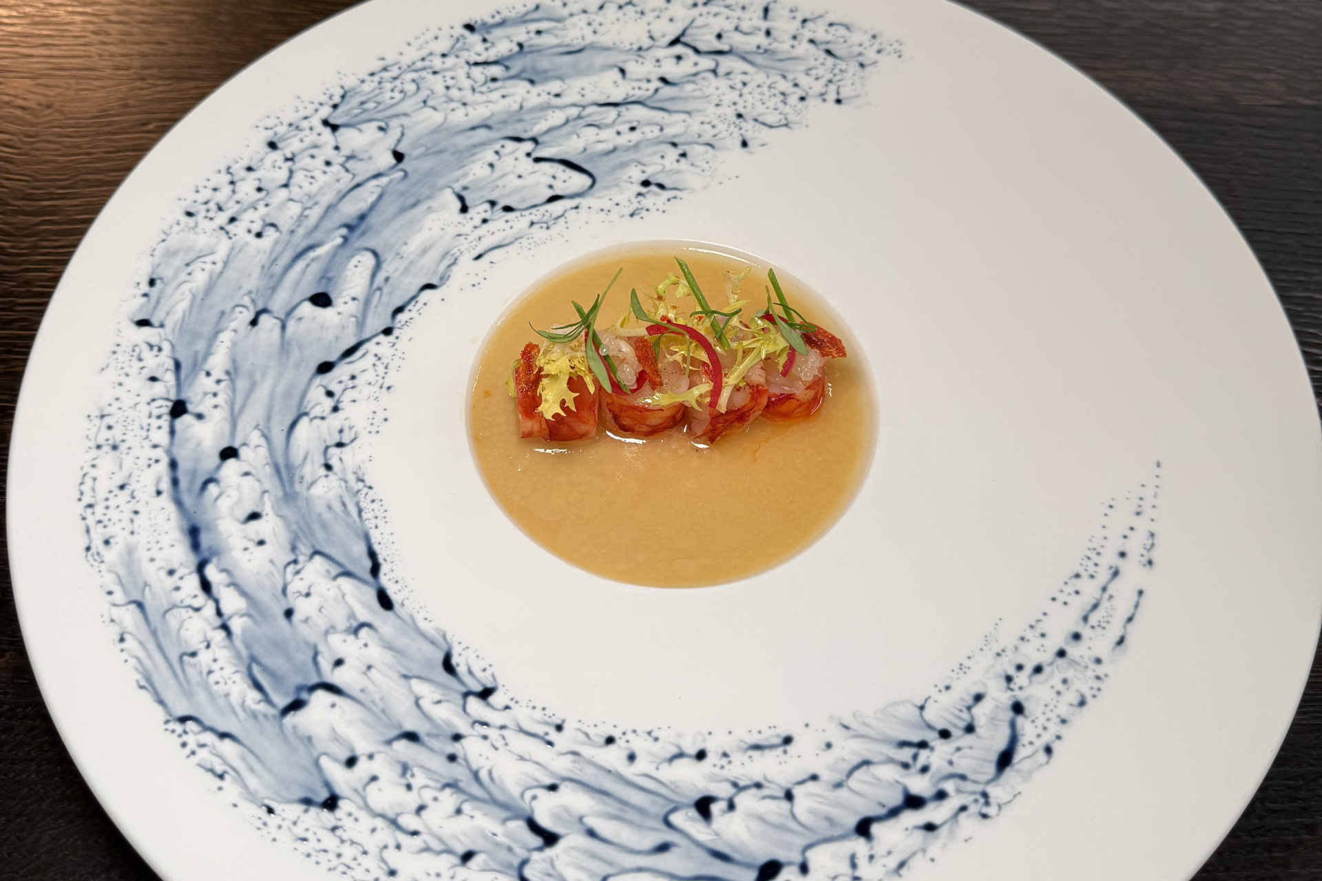 Mit der spanischen Carabinero beginnt eine neue Phase des Menüs: mehr Tiefe, mehr Konzentration. Die Kombination mit Fingerlimette und Ingweröl bringt eine vibrierende Frische, fast elektrisch auf der Zunge. Das Schalotten-Dashi mit Gruyère und Périgord-Trüffel ist dann pure Reduktion. Ein Gang, der zeigt, wie viel Kraft in scheinbarer Einfachheit liegen kann.